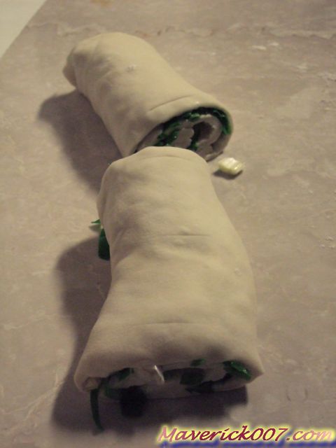 將斬段的夾蔥麵團拉長再盤成螺旋狀
