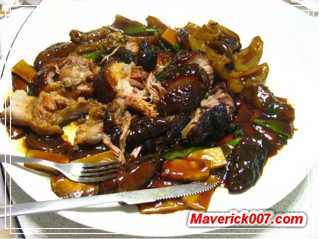 【元蹄烏參】(上圖:分切前,下圖:分切後)整隻滷得透爛的蹄膀,配上肉厚的烏參跟筍片青椒。