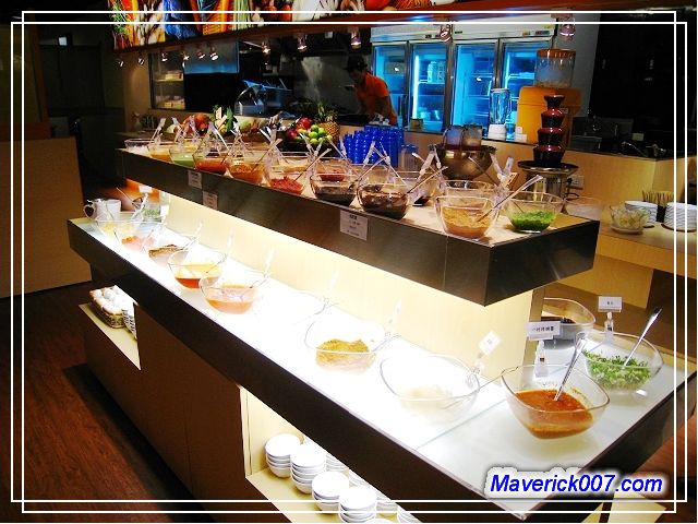 果汁與黑巧克力噴泉前方放著「據說」有四十幾種調味料