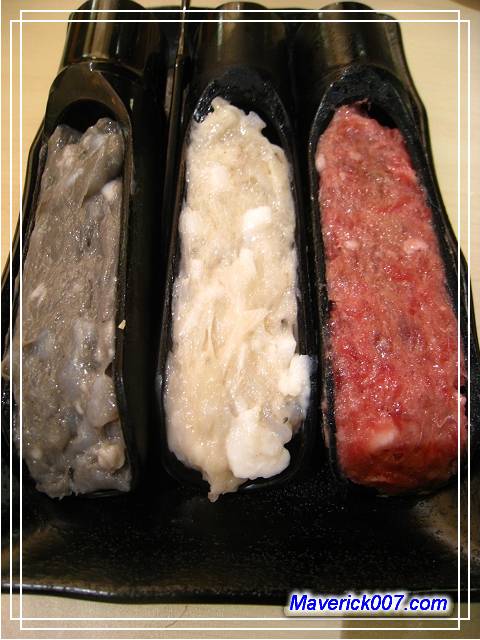 手工丸--左起:墨魚丸、蝦丸、牛肉丸 (說是丸,不過是像花枝漿那樣給一管自行拿捏份量下鍋)