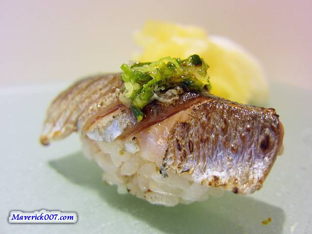 【蟹親子握】蟹肉倒扣紫蘇葉上 握好壽司後 移走紫蘇放上蟹味噌